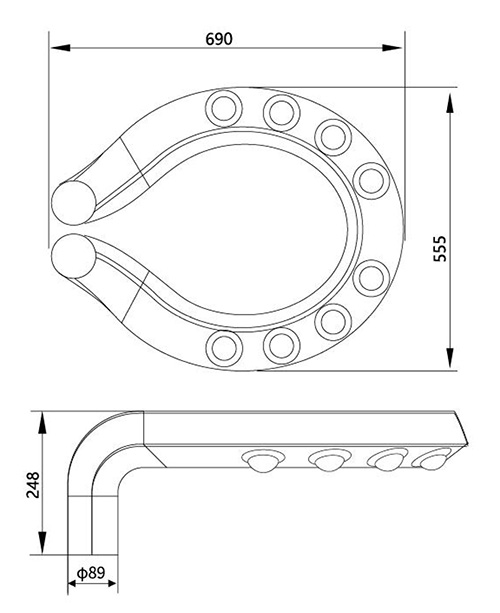 This model's mains-powered garden light has a power range of 30W to 60W, and its dimensions are 690mm long, 555mm wide, and 248mm high (or similar). These clear dimensions facilitate planning and layout before installation, making it suitable for outdoor public spaces with specific size restrictions.