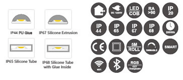 The power range is 10W-14W, with a unit luminous flux of approximately 100-140lm/W. It utilizes a high-density LED layout (e.g., 120 LEDs/meter). It offers continuous, flicker-free operation and is available with either a silicone casing (IP67 rating) or an open-frame design (IP20). It supports CCT dual-color temperature adjustment and RGBW mixed lighting and requires a controller. It is suitable for advertising light boxes, architectural outline lighting, and home decorative lighting.