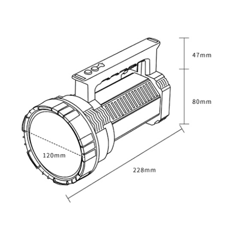 The large-spot lithium-ion searchlight features a 228mm large-aperture optical system, providing a wide and uniform illumination range, suitable for medium and long-range lighting scenarios. Its built-in 6600mAh lithium-ion battery supports long-term continuous operation and features a Type-C charging port for efficient charging. Its housing is constructed of engineering-grade ABS material and features a waterproof design, making it suitable for a variety of outdoor environments. The light body is equipped with heat dissipation fins to help maintain stable light efficiency during extended use. The control panel features multiple dimming modes, allowing users to adjust the brightness according to their needs. Its overall design balances portability and functionality, making it suitable for professional applications such as inspections, rescue operations, and construction sites.